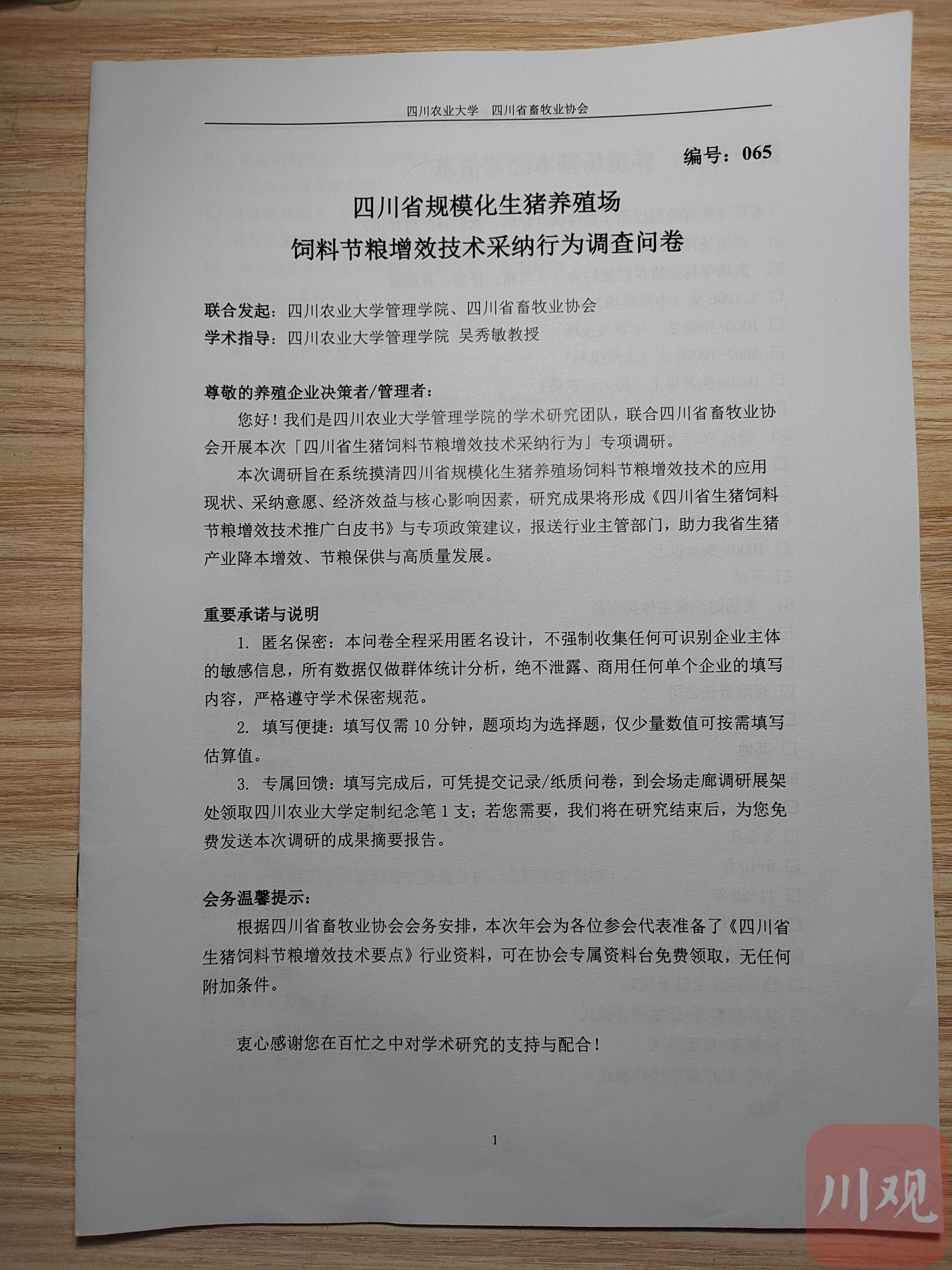 3月28日下午,四川省畜牧业协会2025年会暨全省畜牧业高质量发展论坛在成都市举行。前来参会的四川恒通内江猪保种繁育有限公司总经理王丽芳注意到,会议桌上特地摆放了一份名为“四川省规模化生猪养殖场饲料节粮增效技术采纳行为调查问卷”的资料。她翻开调查问卷发现,里面涉及了饲料节粮增效技术应用现状等相关内容。“每年都来参加活动,但收到这种调查问卷今年还是第一次。”王丽芳说。与王丽芳类似,前来参会的600余名嘉宾都收到了这样一份问卷,其中一半以上与会嘉宾来自生猪养殖行业。