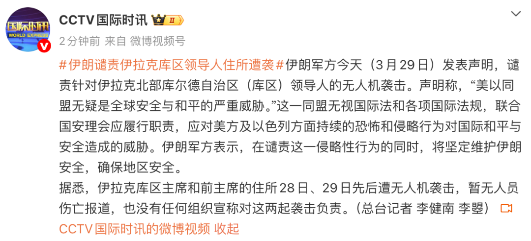 伊朗军方今天(3月29日)发表声明,谴责针对伊拉克北部库尔德自治区(库区)领导人的无人机袭击。声明称,“美以同盟无疑是全球安全与和平的严重威胁。”这一同盟无视国际法和各项国际法规,联合国安理会应履行职责,应对美方及以色列方面持续的恐怖和侵略行为对国际和平与安全造成的威胁。伊朗军方表示,在谴责这一侵略性行为的同时,将坚定维护伊朗安全,确保地区安全。