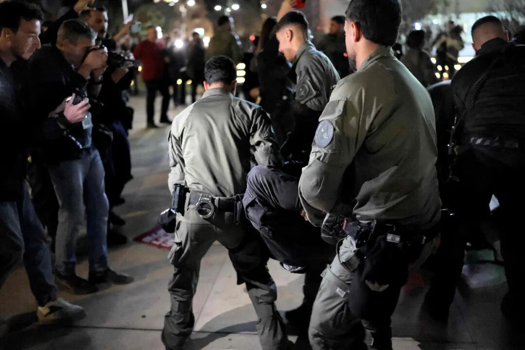 据在场的法新社记者报道,在特拉维夫市中心哈比马广场举行的集会上,至少有4人被拘留,部分抗议者被推倒在地。
