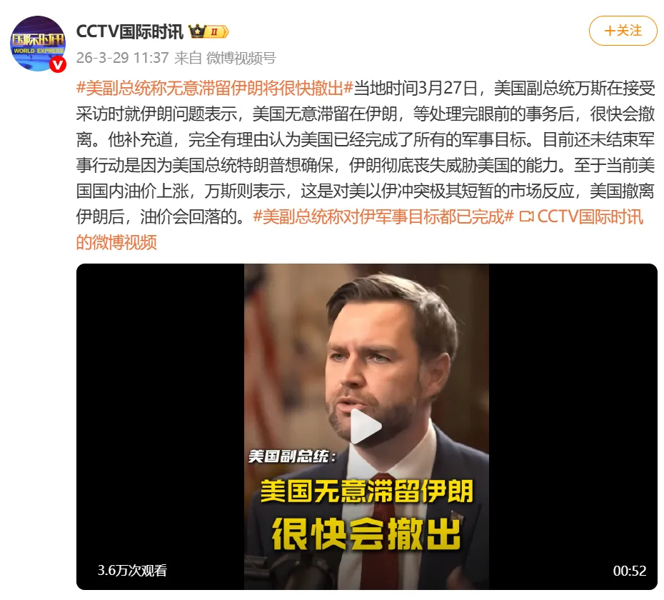 当地时间3月27日,美国副总统万斯在接受采访时就伊朗问题表示,美国无意滞留在伊朗,等处理完眼前的事务后,很快会撤离。