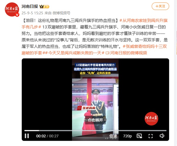 万次磨砺铸荣光,一双手套见担当。河南日报社此次入选的网络正能量音视频作品,以细腻笔触、温情镜头,讲述了河南小伙张威的热血故事,让家国情怀与亲情暖意撞个满怀。作为纪念中国人民抗日战争暨世界反法西斯战争胜利80周年阅兵式升旗手,张威在严苛的训练中,用汗水浇灌使命,用坚持诠释忠诚,硬生生磨破13双手套,以万次精准无误的“展旗”“收旗”练习,践行着护卫国旗的铮铮誓言。视频中,当母亲看到儿子磨破的手套而泪水浸湿眼眶,这一瞬间,大国仪仗的荣光与普通家庭的温情交融共生,直抵人心,网友热评:“这是热血担当,更是最珍贵的礼物。”