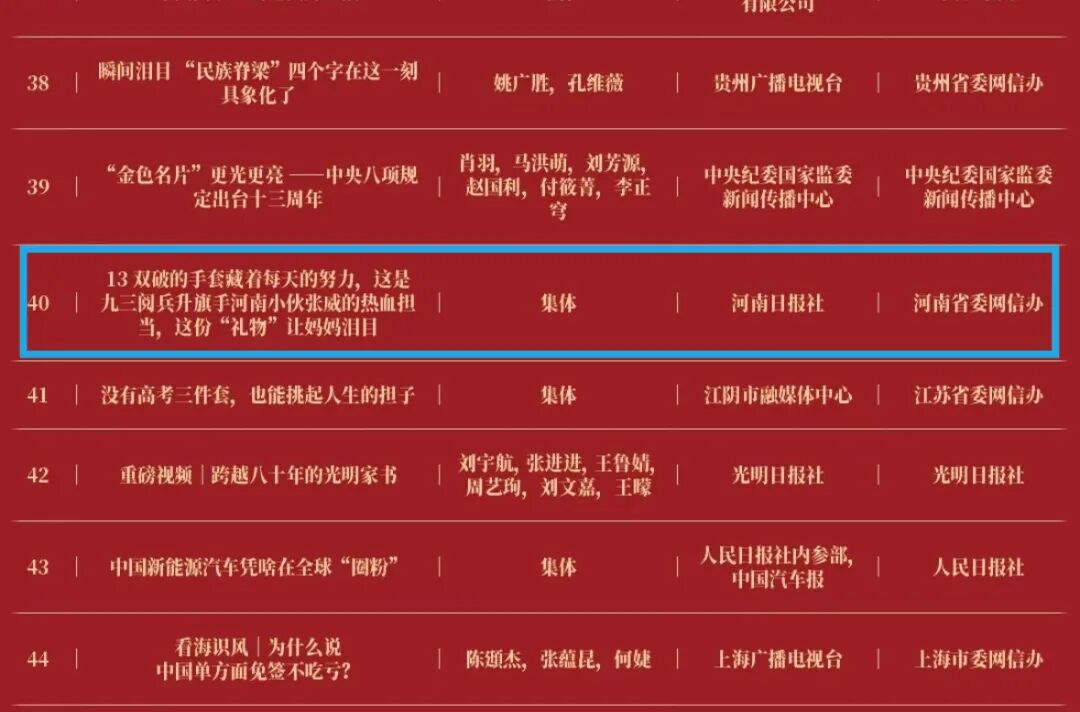 这3件入选作品各有侧重、特色鲜明,既体现了河南日报社在融媒创新和内容创作上的扎实功底,也彰显了主流媒体的责任与担当。其中,“了不起的甲骨文”香港展入选网络正能量专题专栏;音视频作品《13双破的手套藏着每天的努力,这是九三阅兵升旗手河南小伙张威的热血担当,这份“礼物”让妈妈泪目》入选网络正能量音视频;由河南省委网信办、河南日报社·大河网、郑州市委网信办联合推出的“何以中国·黄河安澜”网络主题宣传活动,入选网络正能量主题活动。
