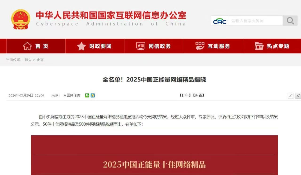 2025中国正能量网络精品征集展播活动由中央网信办主办,以“奋斗的你我 奋进的中国”为主题,旨在征集遴选展播一批有内涵、有温度、有影响的正能量网络精品。活动最终评选出文字、图片、音视频、专题专栏、主题活动五大类550件网络精品。