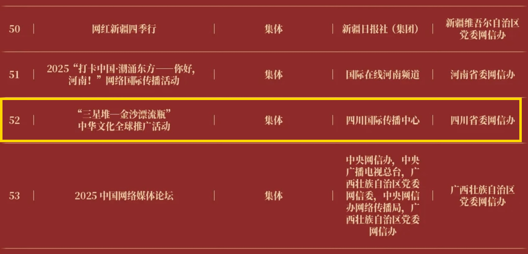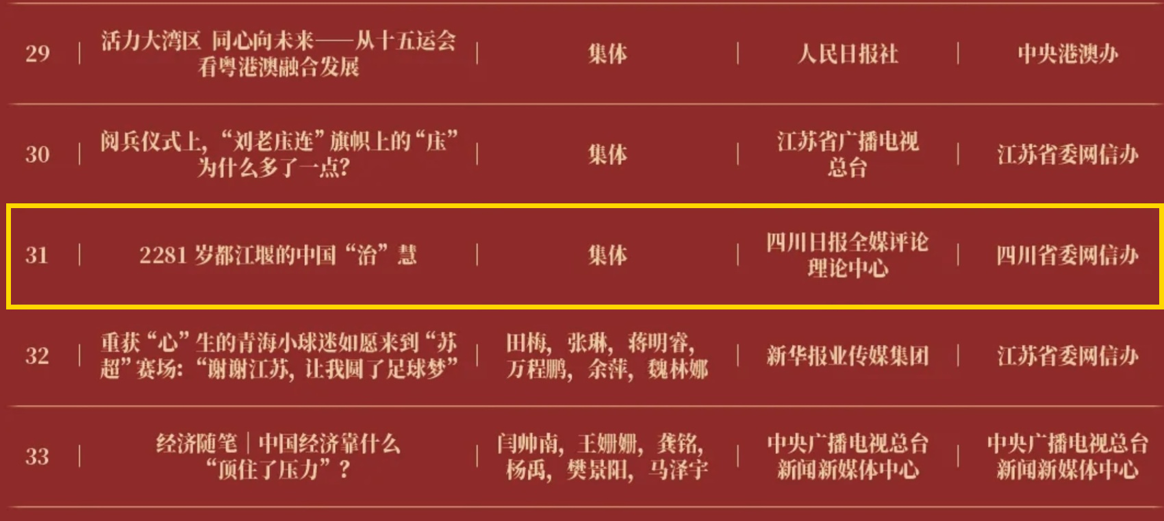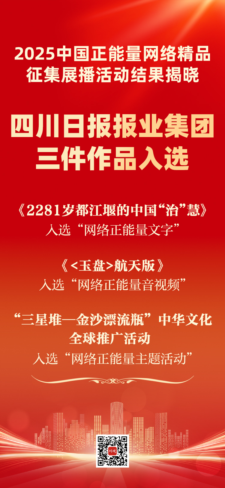 3月29日,2025中国正能量网络精品征集展播活动结果揭晓。四川日报报业集团主创的3件作品从全国众多网络精品中脱颖而出——《2281岁都江堰的中国“治”慧》入选“网络正能量文字”,《<玉盘>航天版》入选“网络正能量音视频”,“三星堆——金沙漂流瓶”中华文化全球推广活动入选“网络正能量主题活动”。