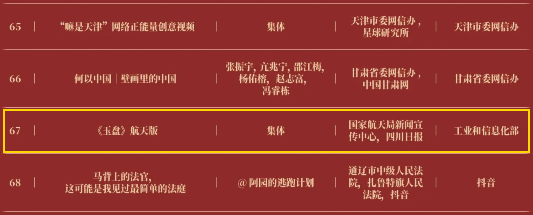 2025年4月24日,第10个“中国航天日”当天,由川观新闻与国家航天局新闻宣传中心联合出品的《<玉盘>航天版》(点击查看作品)歌曲MV正式上线。作品邀请到央视春晚爆款歌曲《玉盘》的原作者谭淇尹参与改编,并携手来自大凉山妞妞合唱团的彝族小朋友、来自葫芦童声的汉族小朋友,以及在航天基地生活的孩子们,一同走进西昌卫星发射中心,以童声演绎,唱响宇宙级浪漫。作品发布后,在川观新闻客户端、四川在线网站等自有平台和四川日报微博、微信、抖音等第三方平台账号上,合计传播量超1.11亿。该作品此前还曾被中宣部评为“三好作品”。