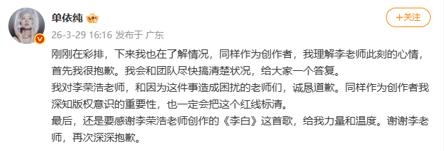 刚刚,单依纯发文回应李荣浩:“刚刚在彩排,下来我也在了解情况,同样作为创作者,我理解李老师此刻的心情,首先我很抱歉。我会和团队尽快搞清楚状况,给大家一个答复。
