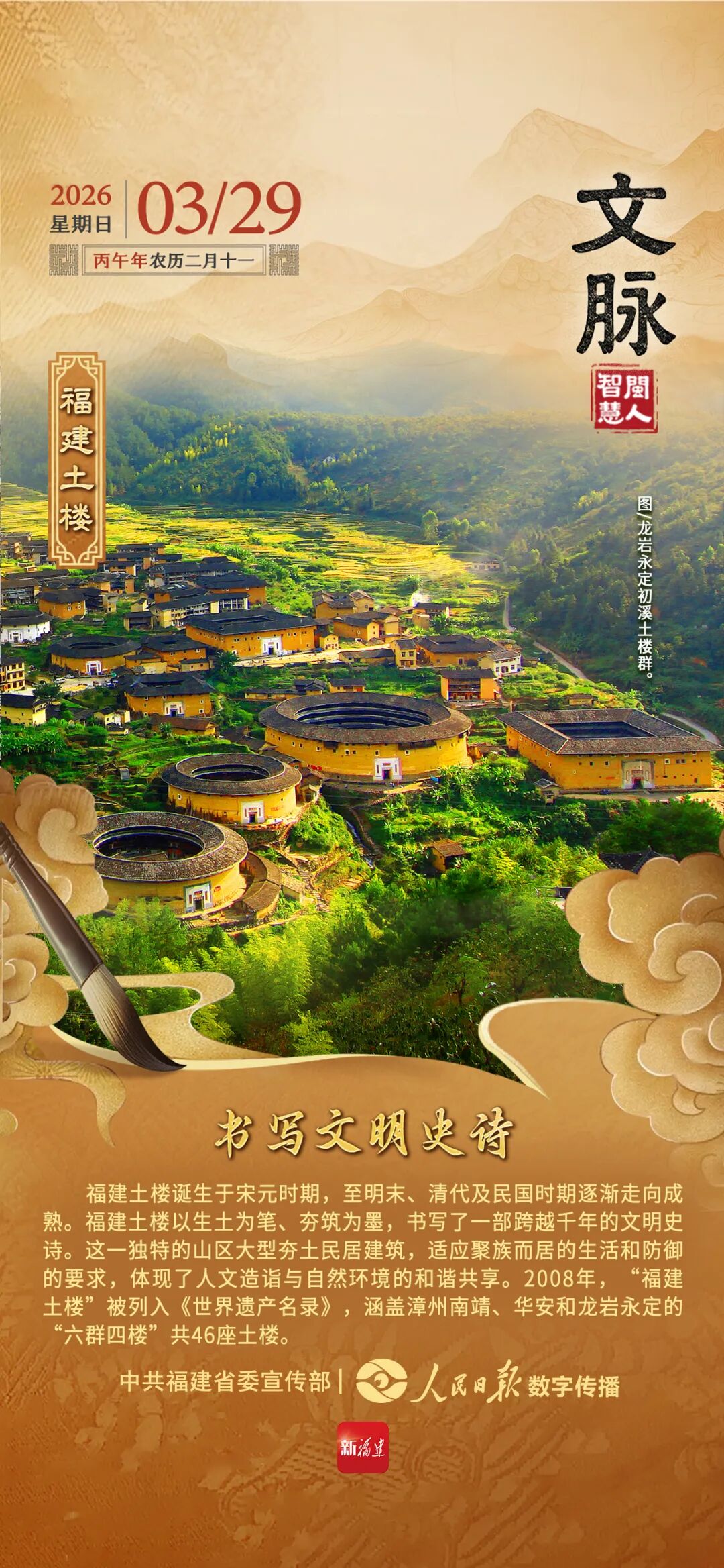 福建土楼诞生于宋元时期,至明末、清代及民国时期逐渐走向成熟。福建土楼以生土为笔、夯筑为墨,书写了一部跨越千年的文明史诗。这一独特的山区大型夯土民居建筑,适应聚族而居的生活和防御的要求,体现了人文造诣与自然环境的和谐共享。2008年,“福建土楼”被列入《世界遗产名录》,涵盖漳州南靖、华安和龙岩永定的“六群四楼”共46座土楼。