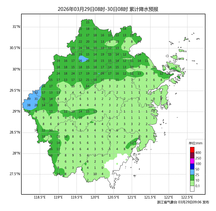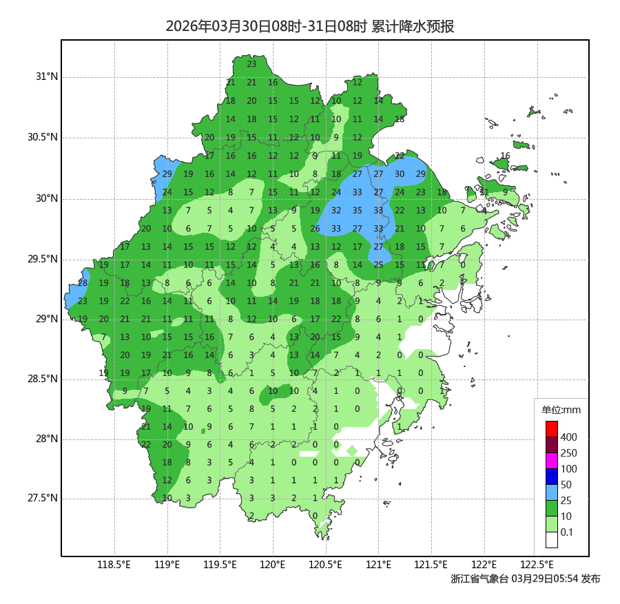 强降水集中区域:浙北和浙西地区,部分有中到大雨,杭州、衢州、丽水、金华、湖州等地局部暴雨;有雷雨地区出现雷暴大风和局地冰雹概率高,个别地区可能出现11级以上雷暴大风。30日沿海海面有8~10级阵风。