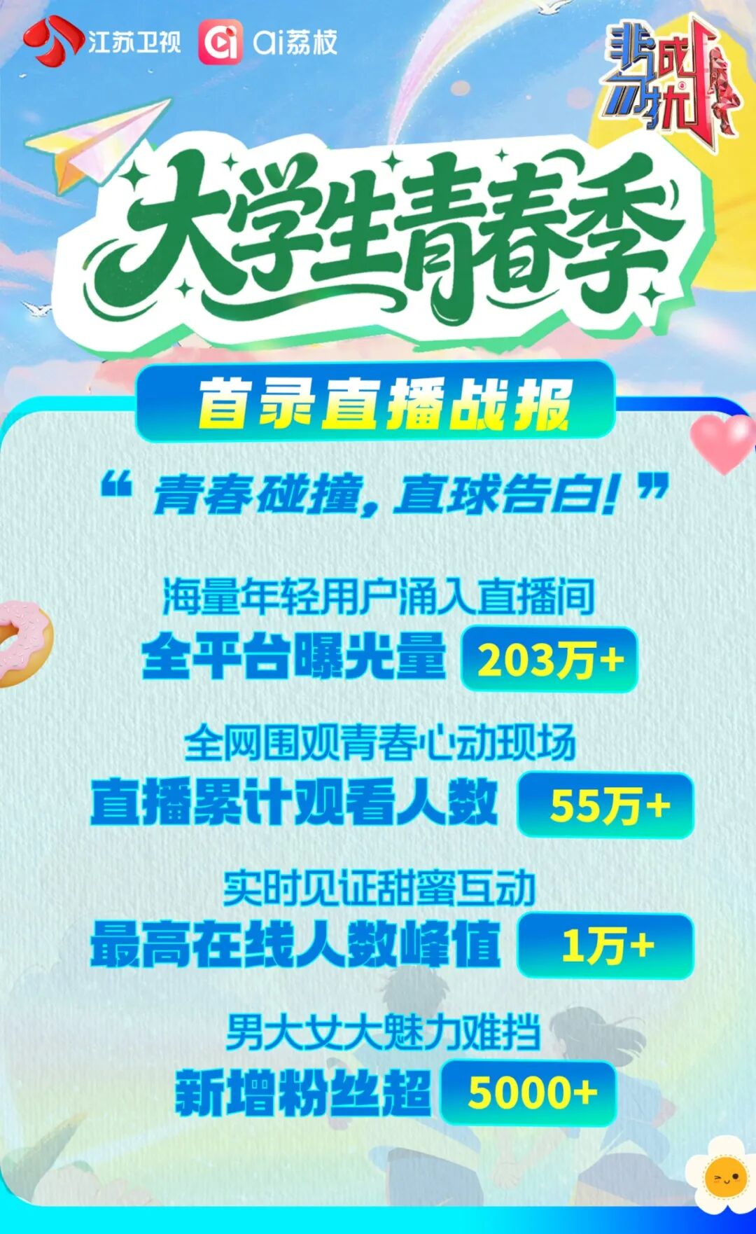 昨晚,《非诚勿扰》大学生青春季在南京完成首次录制。在节目录制的同时,ai荔枝、《非诚勿扰》官方微博、抖音、视频号等多平台进行网络直播,打造“录制+直播+现场+云端”的联动内容生产形态。直播收获全网热烈反响,全平台曝光量203万+,海量年轻用户涌入直播间,累计观看人数55万+,最高在线人数峰值1万+,实时见证甜蜜互动,新增粉丝超5000+,男大女大魅力难挡。