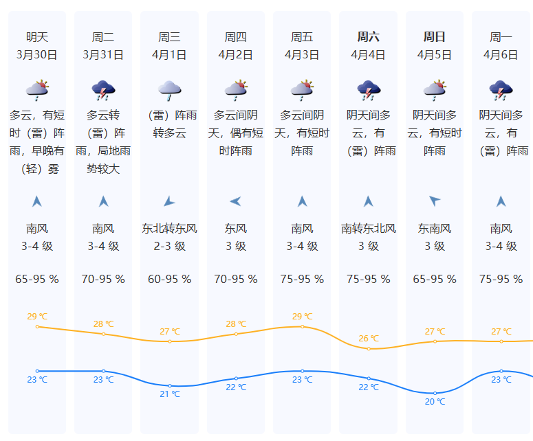周二至周三(31日-4月1日)有雷阵雨,局地雨势较大,并伴有8级或以上雷暴大风;