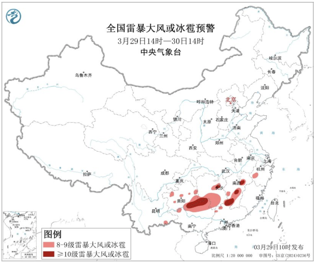 其中,今天(3月29日)至31日将迎来今年首场大范围强对流天气,贵州东南部、湖南中北部、江西、广西北部、广东北部、福建中北部等地部分地区有大雨或暴雨,局地大暴雨;贵州、江南中西部、华南北部等地的部分地区伴有雷暴大风或冰雹、短时强降水等强对流天气。