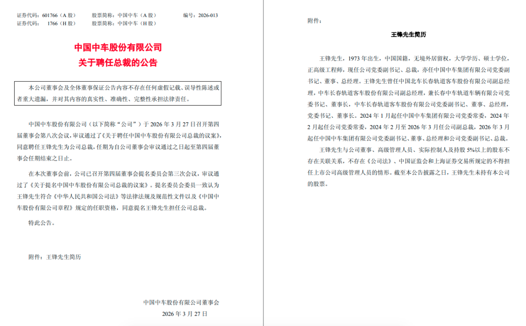 中国中车3月27日晚间公告,董事会审议通过了《关于聘任中国中车股份有限公司总裁的议案》,同意聘任王锋为公司总裁,任期为自公司董事会审议通过之日起至第四届董事会任期结束之日止。