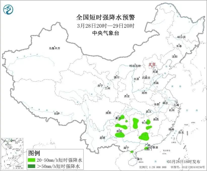 预计3月28日20时至29日20时,湖南东北部和南部、江西中西部、广西北部和西部、广东西北部、云南中南部、贵州东南部等地的部分地区将有8级以上雷暴大风或冰雹天气;湖南西部和东部、江西西部、广西西北部、广东北部、重庆南部、贵州中南部等地的部分地区将有小时雨量大于20毫米的短时强降水天气。