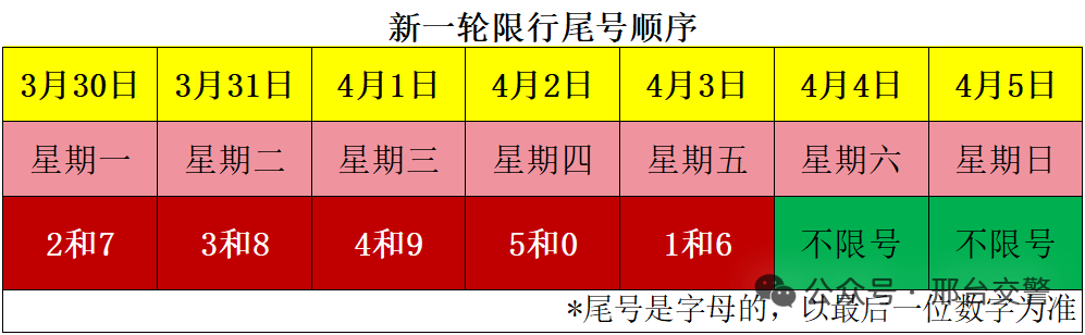 3月30日(周一)起,邢台市机动车尾号限行将进入新一轮轮换期(限行规则与北京保持一致)。