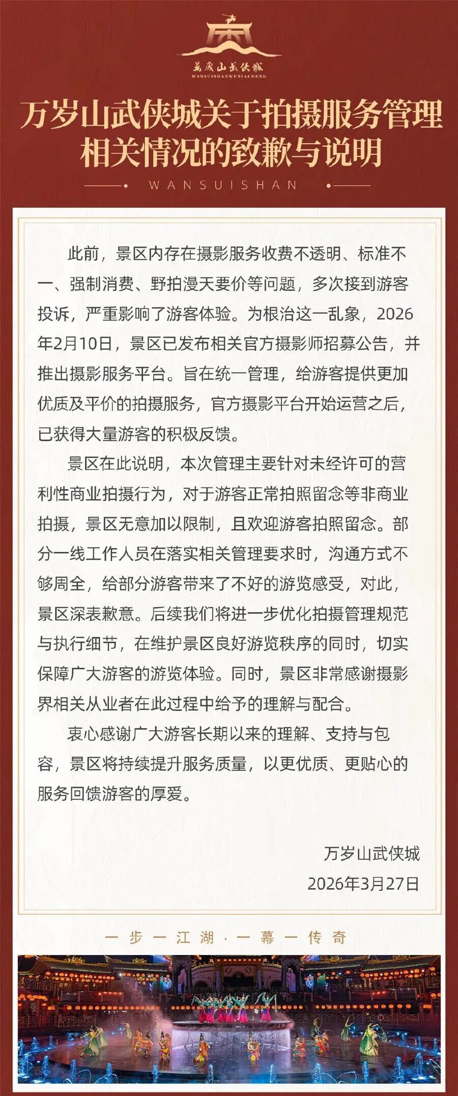 3月27日,万岁山武侠城发布关于拍摄服务管理相关情况的致歉与说明,全文如下: