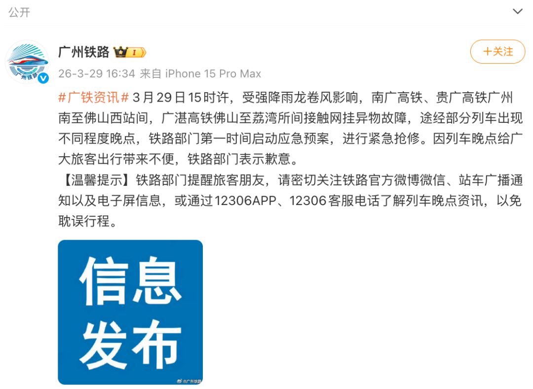 3月29日16时34分,广州铁路官方微博发布消息称:15时许,受强降雨龙卷风影响,南广高铁、贵广高铁广州南至佛山西站间,广湛高铁佛山至荔湾所间接触网挂异物故障,途经部分列车出现不同程度晚点。铁路部门已第一时间启动应急预案进行紧急抢修,对列车晚点给旅客带来的不便表示歉意,并提醒旅客密切关注铁路官方微博微信、站车广播通知及电子屏信息,或通过12306APP、12306客服电话了解列车晚点资讯。