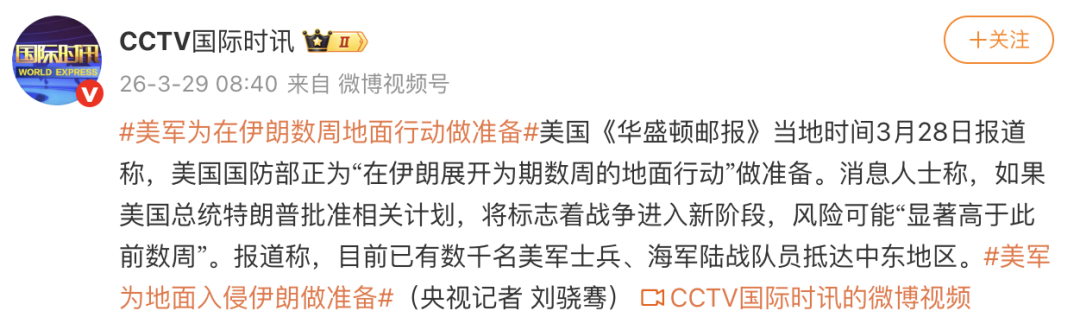 美国《华盛顿邮报》当地时间3月28日报道称,美国国防部正为“在伊朗展开为期数周的地面行动”做准备。消息人士称,如果美国总统特朗普批准相关计划,将标志着战争进入新阶段,风险可能“显著高于此前数周”。报道称,目前已有数千名美军士兵、海军陆战队员抵达中东地区。