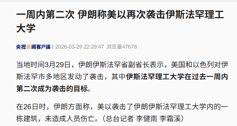 在26日时,伊朗方面称,美以袭击了伊朗伊斯法罕理工大学内的一栋建筑,未造成人员伤亡。