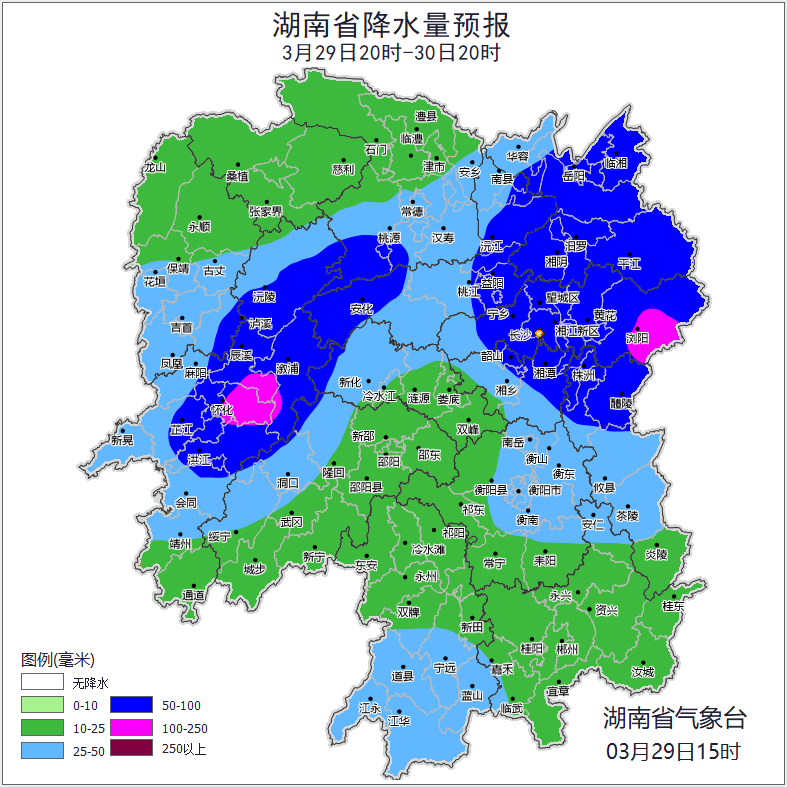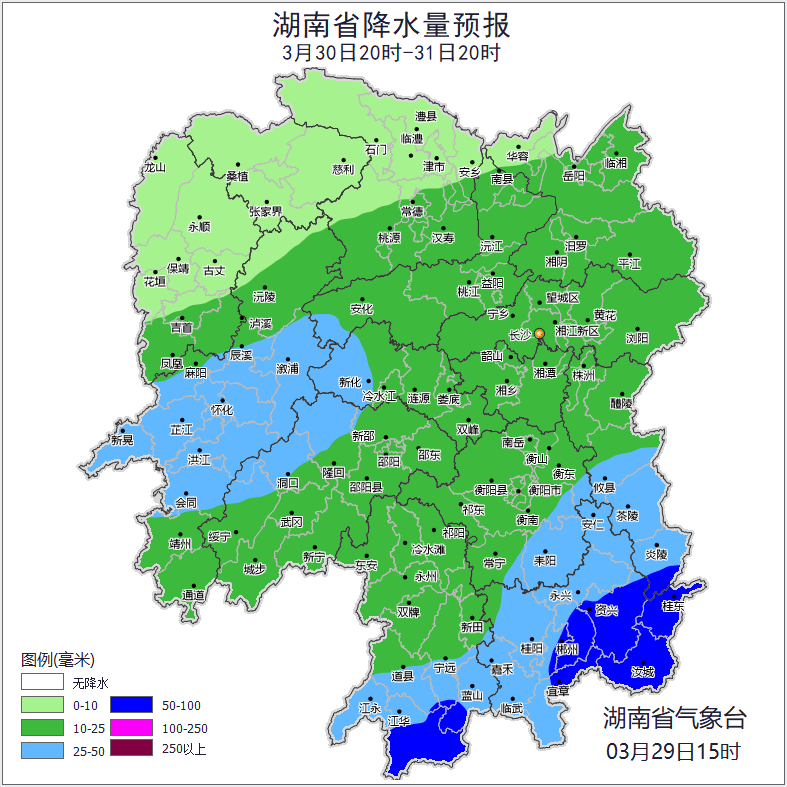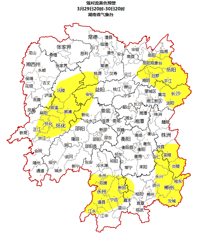 根据省气象局3月29日预报,省水利厅与省气象局联合会商得出如下结论:受降雨影响,29日20:00至30日20:00,岳阳市,怀化市,长沙市,株洲市,邵阳市,湘潭市,益阳市,娄底市等局地可能发生山洪灾害。