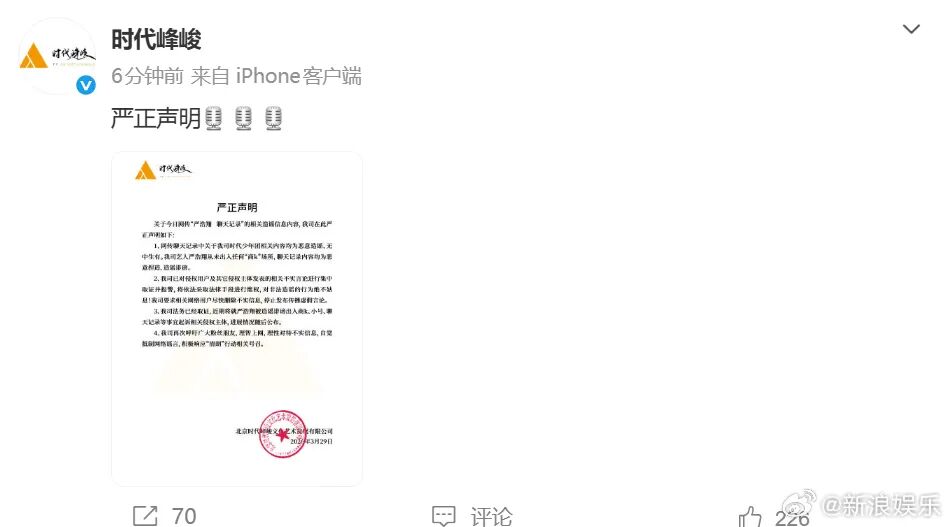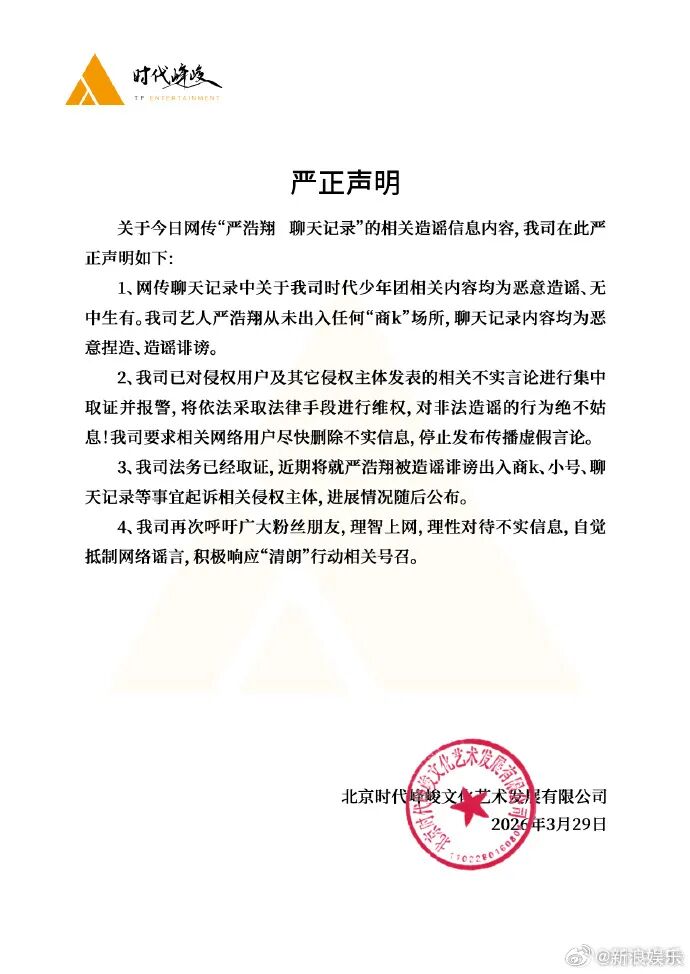 刚刚,@时代峰峻 发声明回应称聊天记录中关于时代少年团的记录均为造谣,严浩翔从未出入任何商k场所,公司已取证。