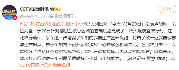 以色列国防军今天(3月29日)发表声明称,以色列空军于28日针对德黑兰核心区域的基础设施完成了一次大规模空袭行动。
