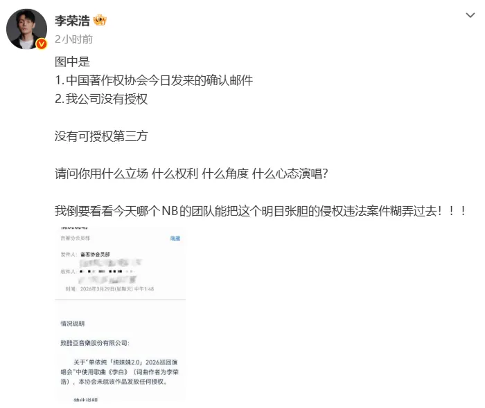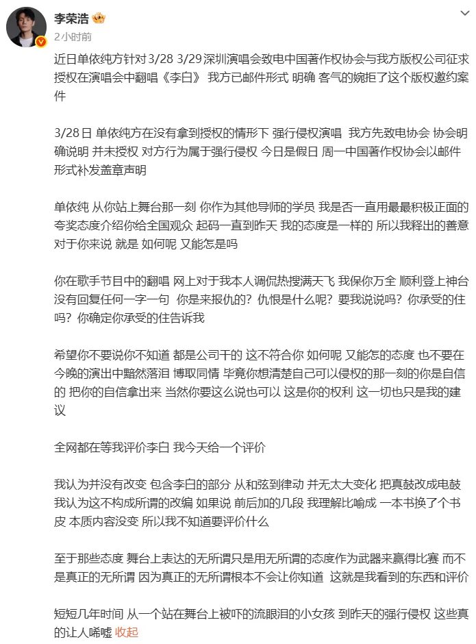 李荣浩称:“近日,单依纯方针对3月28、3月29深圳演唱会致电中国著作权协会与我方版权公司征求授权在演唱会中翻唱《李白》,我方已邮件形式,明确、客气的婉拒了这个版权邀约案件。