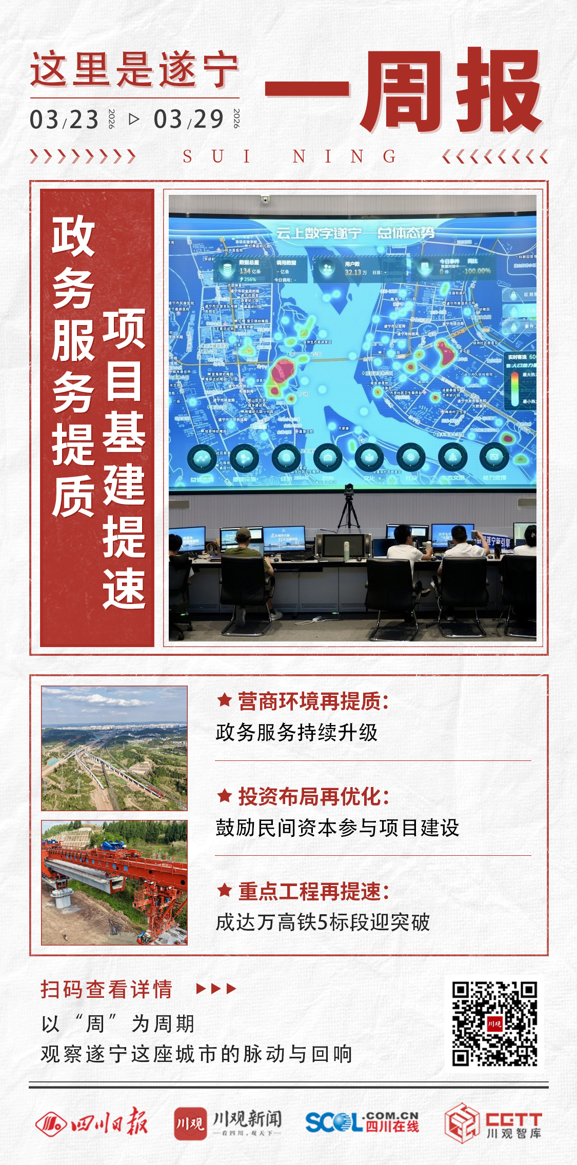 3月23日至3月29日,这一周,遂宁聚焦发展提质增效,政务服务改革持续深化,项目投资布局不断优化,重点交通工程建设取得关键突破,城市发展活力持续释放。