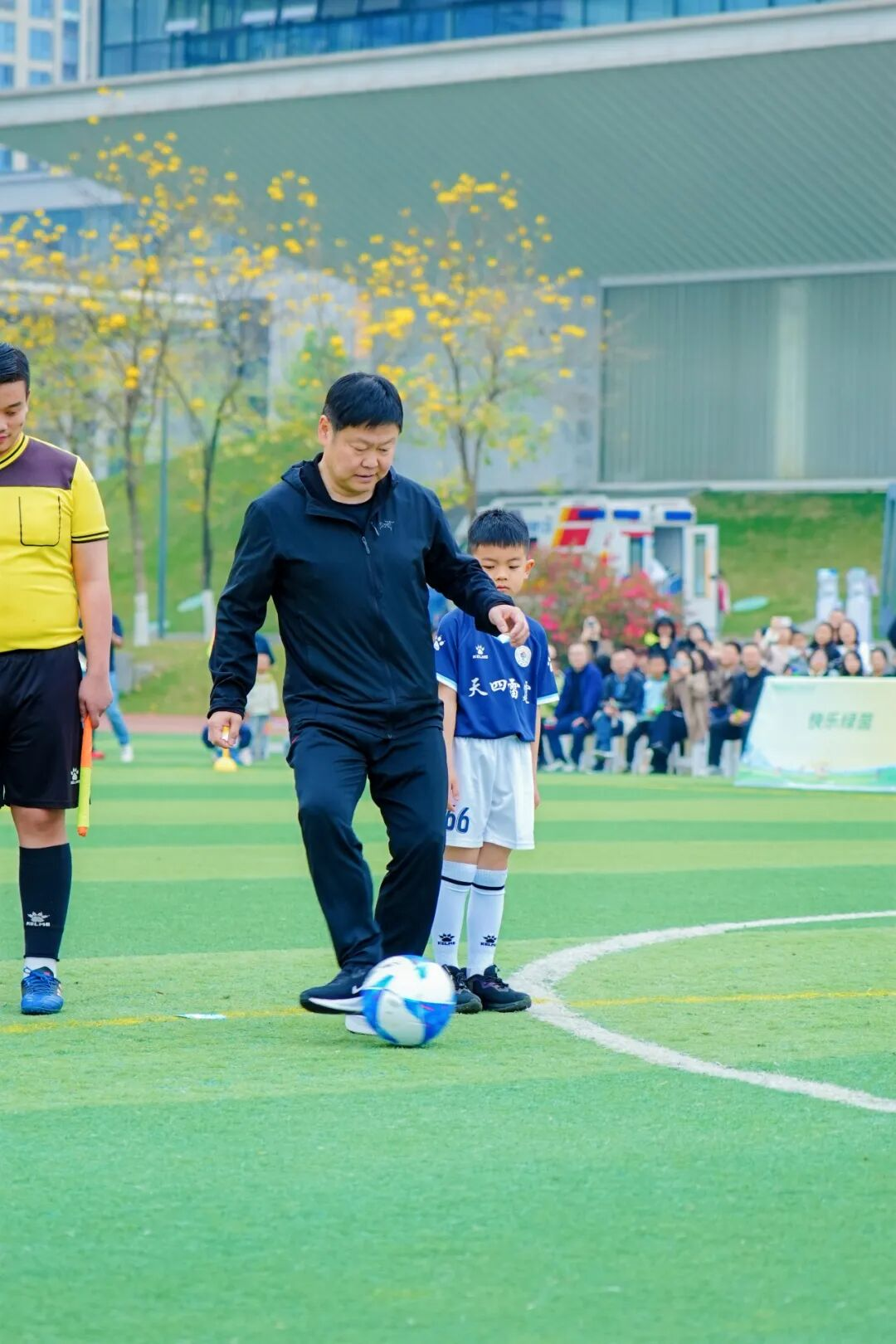 开球仪式上,一只灵动的机器狗托举足球步入球场,前国脚马明宇、姚夏等足坛名宿共同完成三角传递开球,以科技感与仪式感并重的方式,点燃了新赛季的“战火”。随后,揭幕战哨声响起,小球员们在绿茵场上奋力拼抢,展现出青少年体育的蓬勃朝气。
