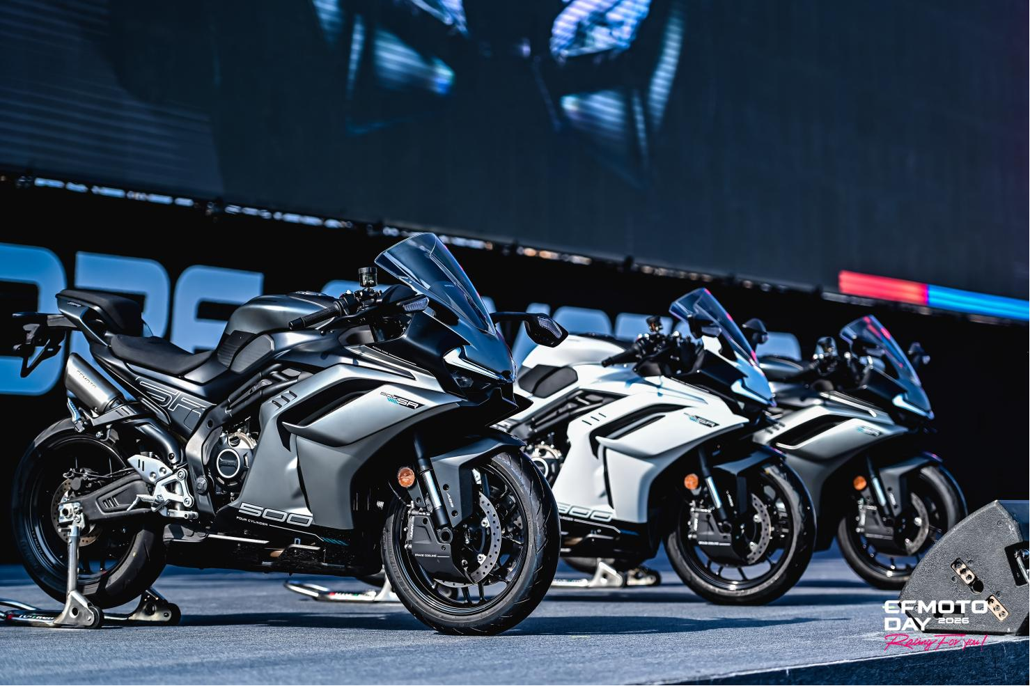 本次“春风日”上,运动仿赛500SR新车发布,国产首台公升级超跑CFMOTO V4 SR-RR完成国内动态首秀。