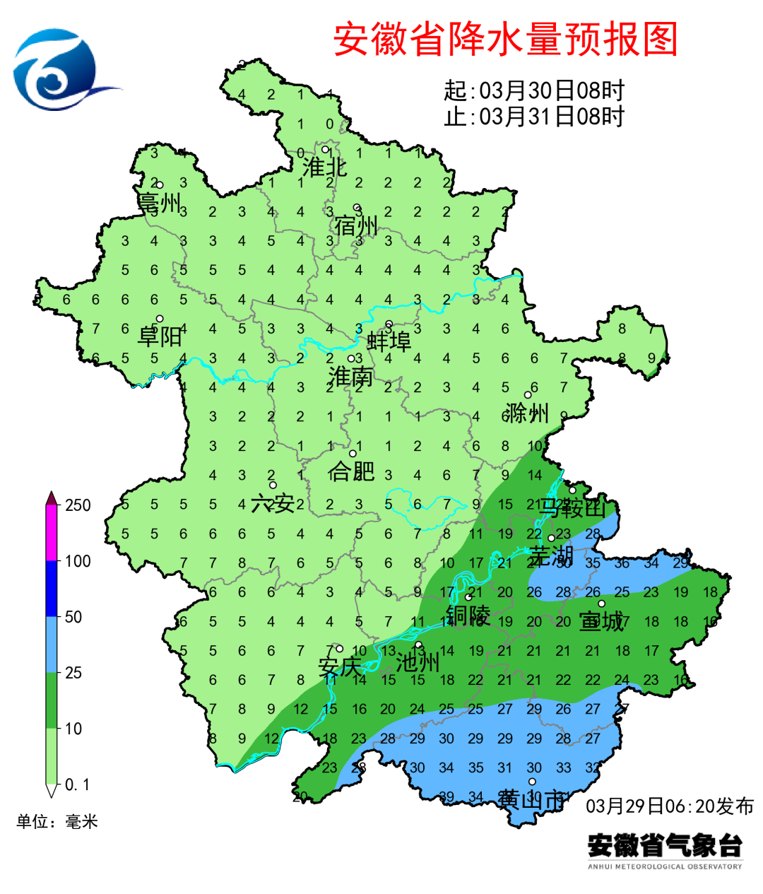降水预报:30日白天,我省有一次较明显降水过程,江淮之间南部和江南部分地区大雨,同时伴有短时强降水(最大小时雨强20~40毫米/小时)和雷电等强对流天气。31日沿江江南有降水。4月2-3日和5-6日我省还将分别有一次降水过程。