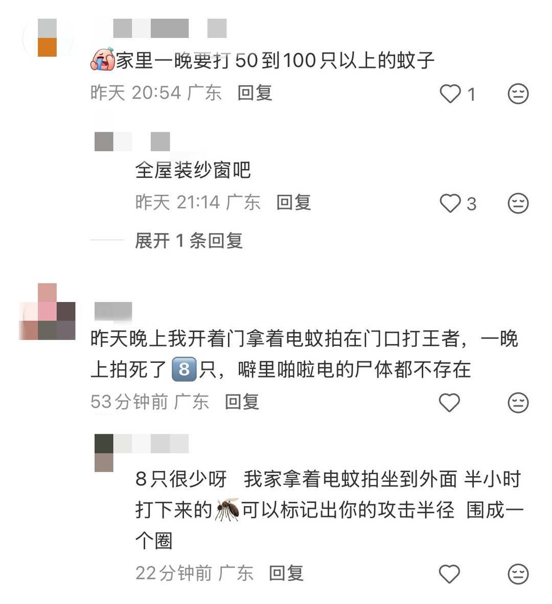 “睡个觉,10个手指被叮了3”“连续一周后半夜被蚊子叮咬痒醒了”“昨晚跟蚊子周旋到4点都还没睡”“上星期开始已经蚊子成堆了”……社交平台上,IP为广东或广西的网友率先开始了蚊子的吐槽大会。有广东网友表示,其实整个冬天,蚊子都没消停,冷空气一过,就开始闹腾。