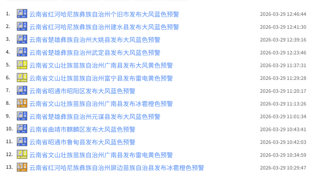 云南省气象台2026年03月29日08时00分继续发布雷电Ⅳ级预警:预计未来12小时雷电活动将持续,红河州、昆明市南部、临沧市、普洱市、曲靖市、文山州、玉溪市将出现较强雷电活动,出现雷击灾害事故的可能性大,局地伴有9级以上阵风、大冰雹、短时强降水等强对流天气,相关部门做好防雷电、防大风、防冰雹工作,公众在强对流过境期间暂停户外活动。