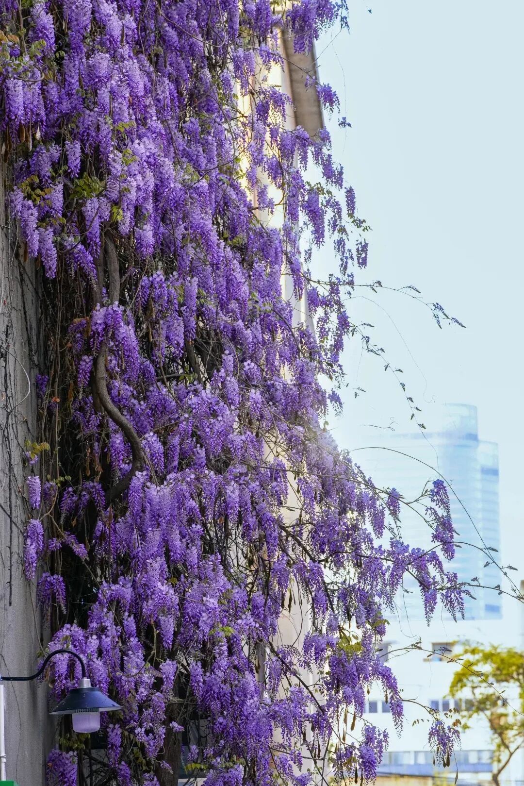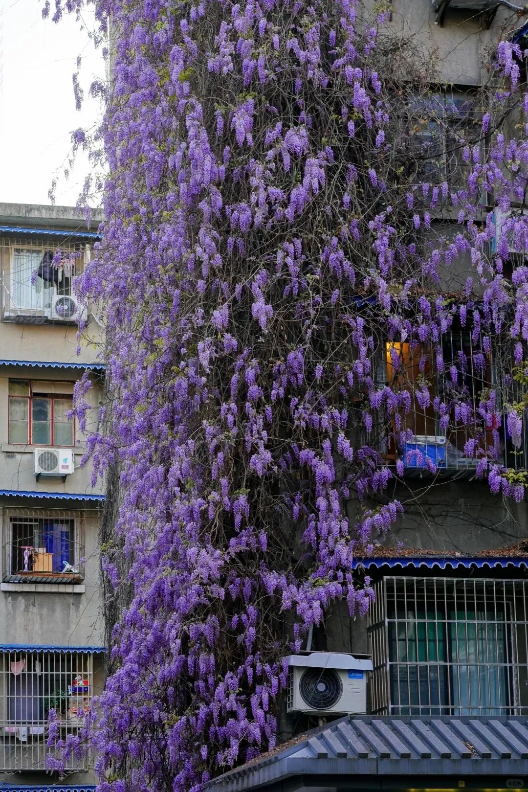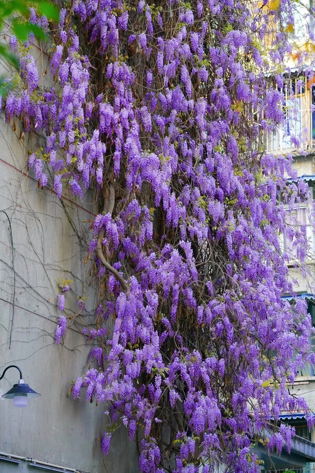 盛开的紫色花花爬满了小区外墙,足足近20米高!满墙紫藤垂落如帘,层层叠叠,把整座墙都染成了温柔的紫色。
