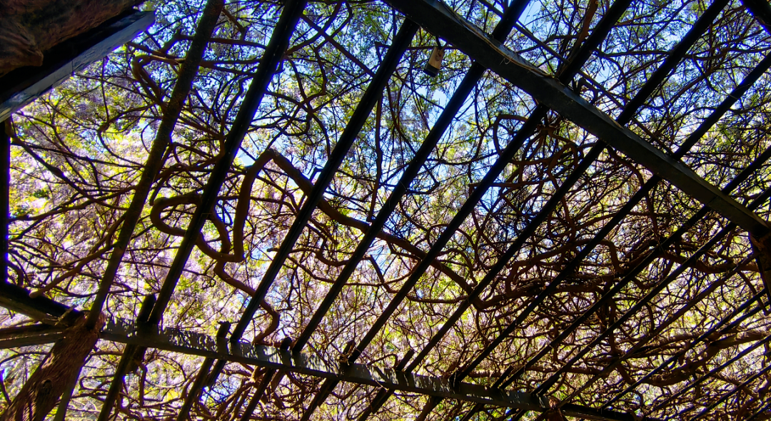 这样的奇景,源于两株相依而生的紫藤古树,人称“连理古藤”(即两株不同根的草木,相互缠绕共生,彼此融为一体)。
