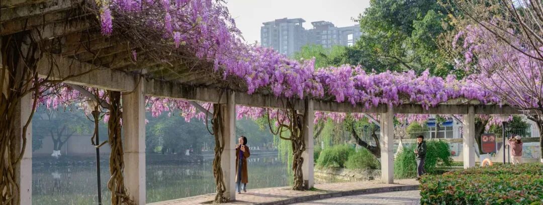 温馨提示:文明赏花,勿攀折花枝,勿摇晃藤蔓。紫藤花期短暂,速去打卡~