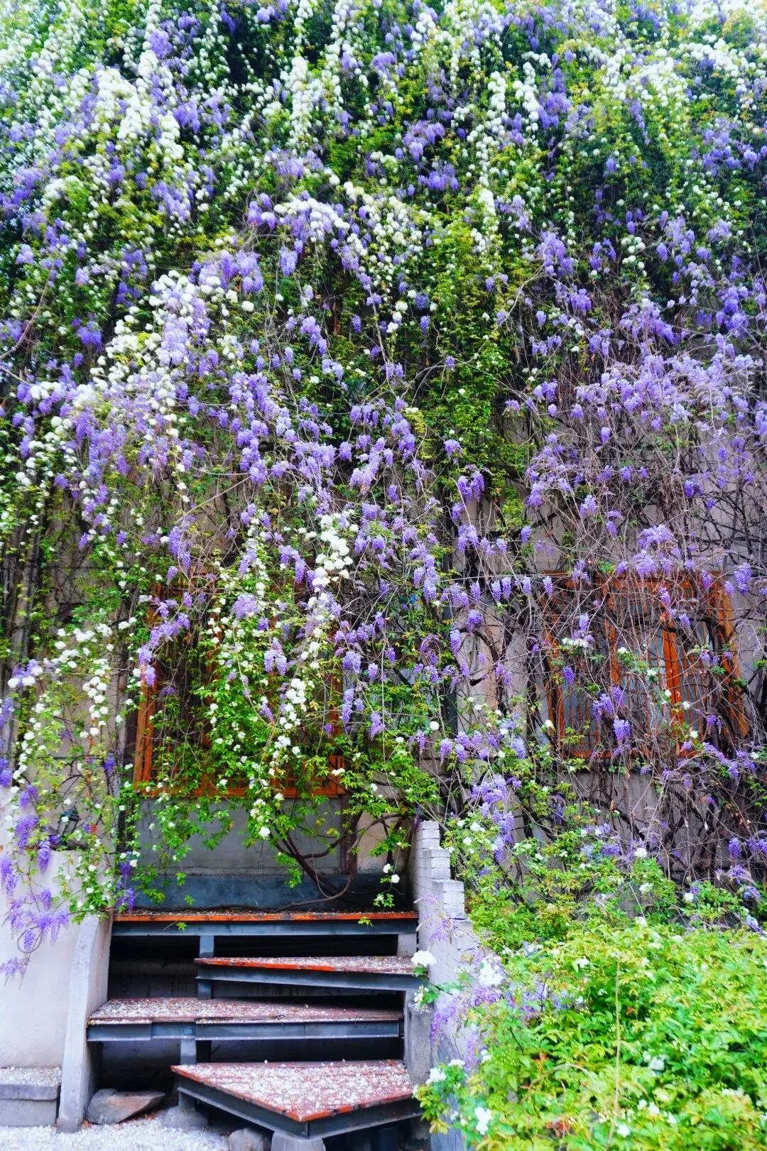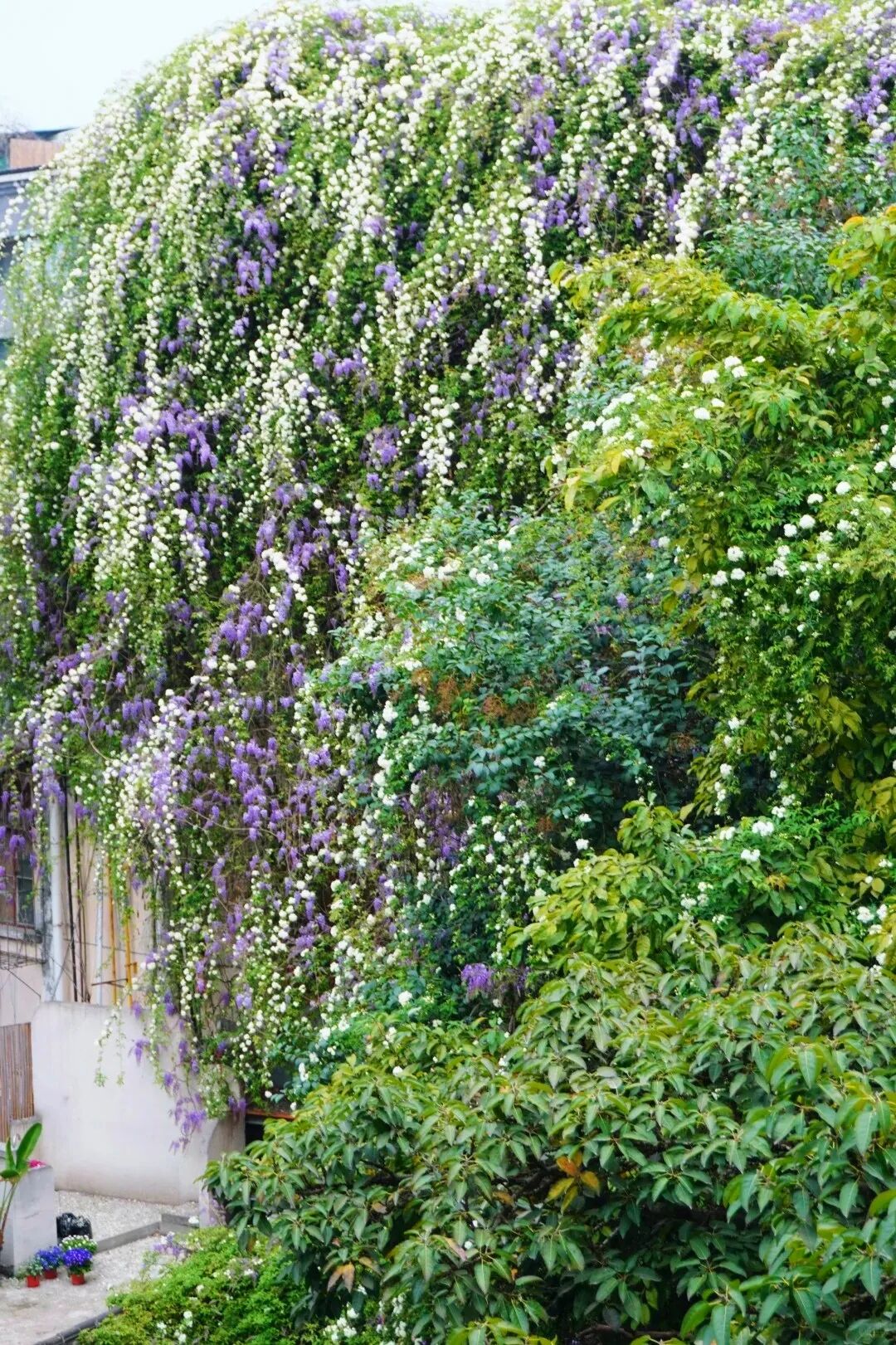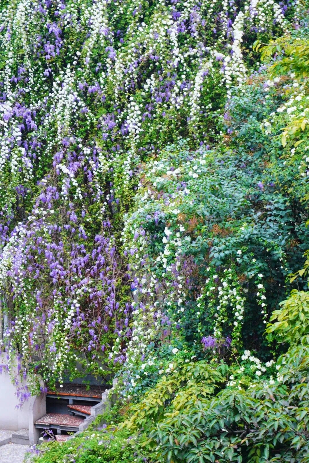 这里的紫藤和七里香相依生长,紫雾与白雪交织,三层楼高的墙面被花海覆盖,一眼望去就如同童话世界!