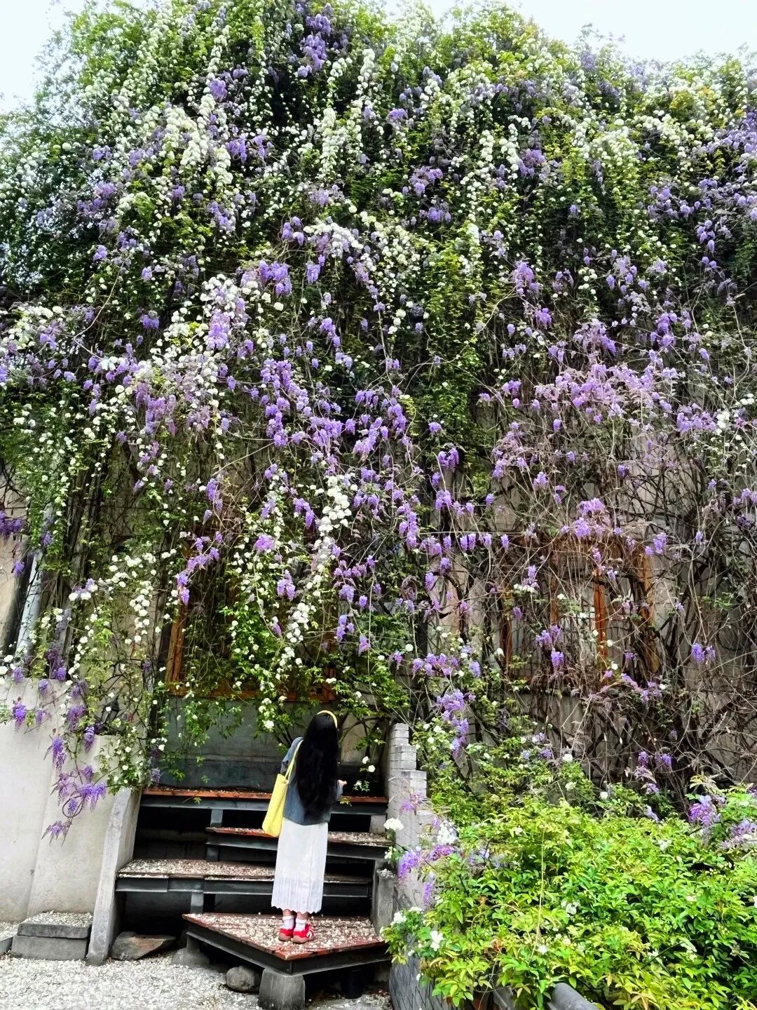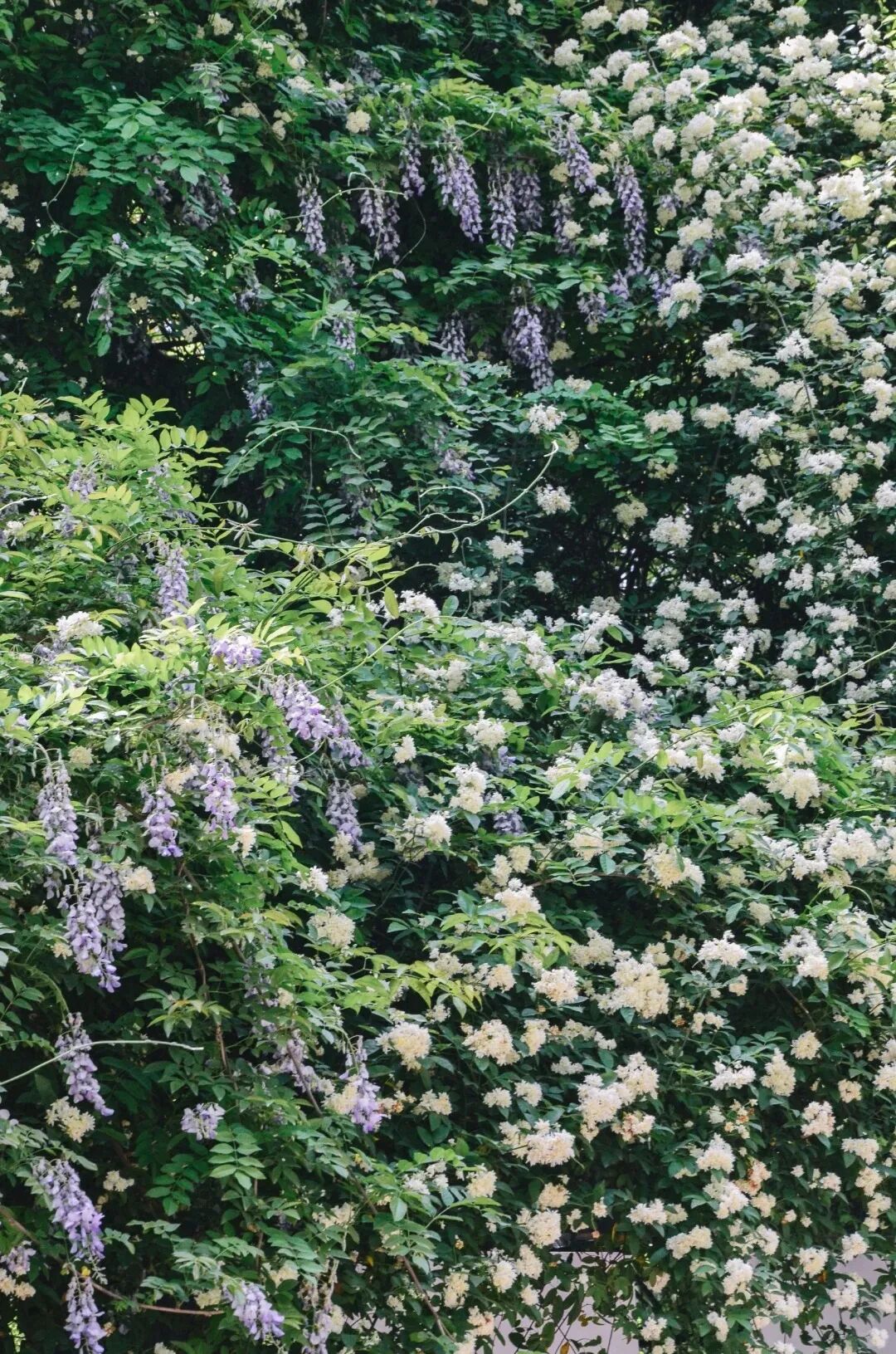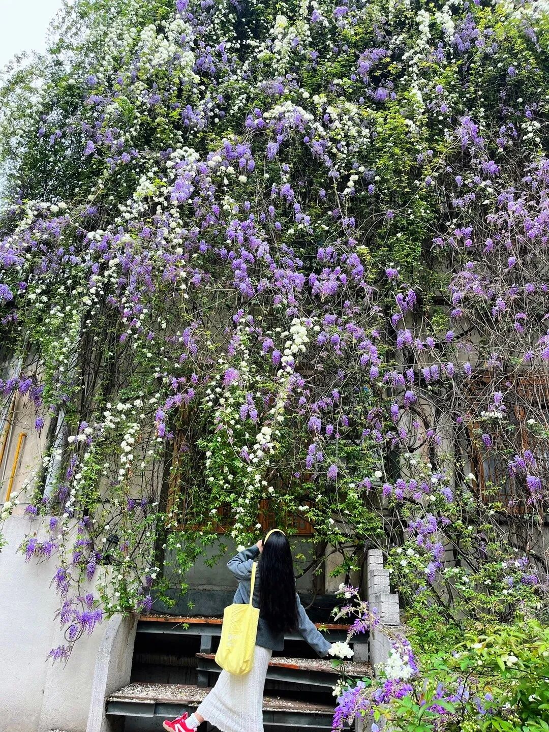 这里的紫藤和七里香相依生长,紫雾与白雪交织,三层楼高的墙面被花海覆盖,一眼望去就如同童话世界!
