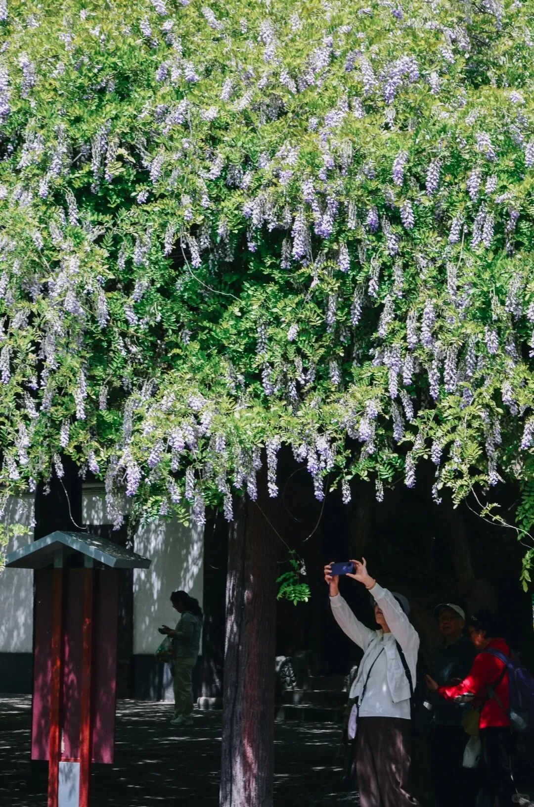 ✅浅色系衣服与紫藤最搭!白色连衣裙、淡粉色衬衫或汉服,都能和紫色花瀑完美融合。