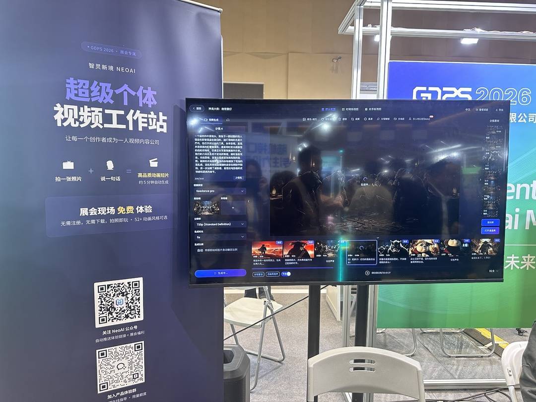 在2026全球开发者先锋大会上,一家AI影视制作平台的展台前围满了人。“你可以直接给一段文字,或者一个想法,它会自动拆分,做成剧本,提取里面的人物、场景、道具,确定美术风格。然后你一步一步傻瓜式操作,最后就能得到一个静态分镜,静态分镜再跑成动态的。”现场工作人员向封面新闻记者介绍。“几分钟就可以做出一个五分钟的短片。”