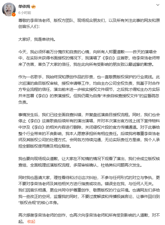 事后单依纯发文道歉,称自己不知情,并表示“已经全面自查纠错,并复盘巡演曲目授权流程”。道歉来得快,态度也算诚恳,但荒诞之处恰恰在于:一个自称“深知版权意识”的职业歌手,刚刚在舞台上干了一件版权意识为零的事,而且是在对方明确说“不”之后。这背后,是团队押注“热度优先”策略,将法律追责视为“可控成本”。