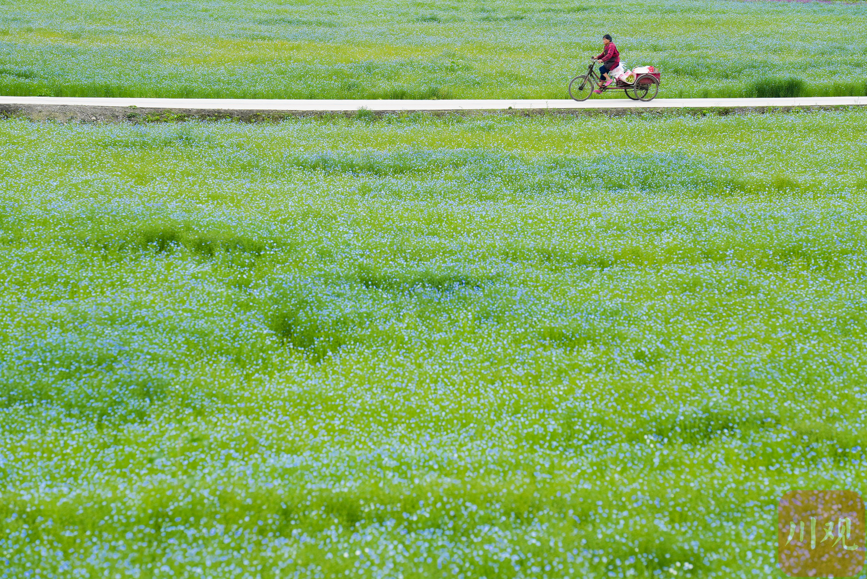 是被打翻的蓝墨池?还是揉碎了一片春日的晴空?连片的亚麻花攒着劲儿盛放,蓝得澄澈,蓝得温柔,像大自然用最细腻的笔触,在金黄的油菜花田边晕染出一方梦幻秘境。风过时,花浪轻涌,细碎的蓝花在阳光下闪着微光,像千万只振翅的蓝蝶,要驮着春日的梦飞向远方……趁花期正好,来温江吧——在蓝色的浪尖上,把春天拥进怀里。