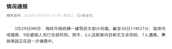 3月29日0时许,海林市海林镇一建筑发生部分坍塌。(海林市发布情况通报:海林镇一建筑发生部分坍塌,目前9人被困)截至30日11时27分,现场完成搜救,9名被困人员已全部找到。其中,2人送医救治目前无生命危险,7人遇难。事故原因正在进一步调查中。