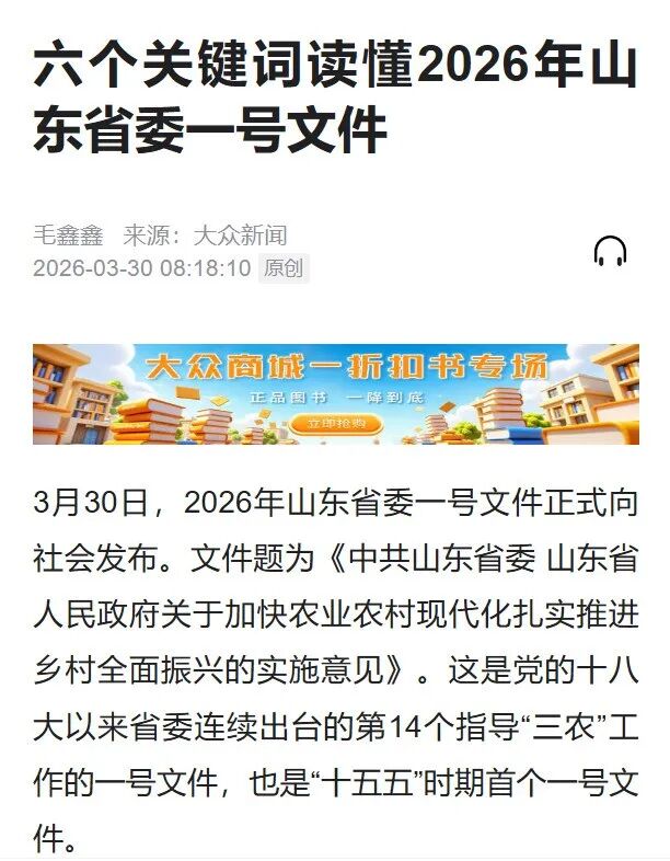 3月30日,2026年山东省委一号文件正式向社会发布。文件题为《中共山东省委 山东省人民政府关于加快农业农村现代化扎实推进乡村全面振兴的实施意见》。这是党的十八大以来省委连续出台的第14个指导“三农”工作的一号文件,也是“十五五”时期首个一号文件。(文件详情)