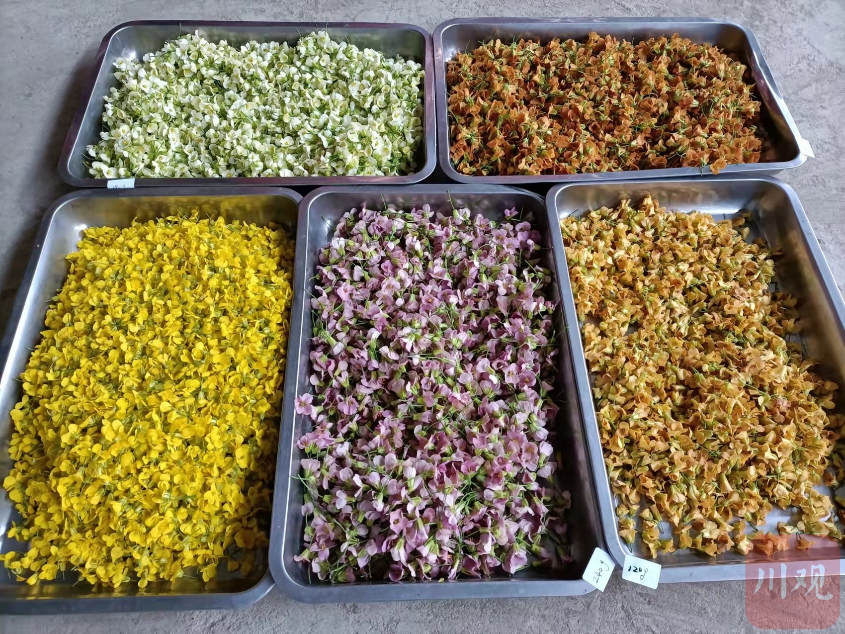 崔成团队烘干的不同颜色油菜花。省农科院供图