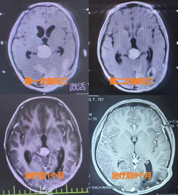 为缩短单次治疗时间,保证小汪安全,龚飞龙决定用伽玛刀分两次放射治疗,中间间隔5天。幸运的是,首次伽马刀放射治疗后,小汪的检查结果显示其脑肿瘤体积缩小了50%。两次伽马刀放射治疗后,脑肿瘤体积缩小了80%。