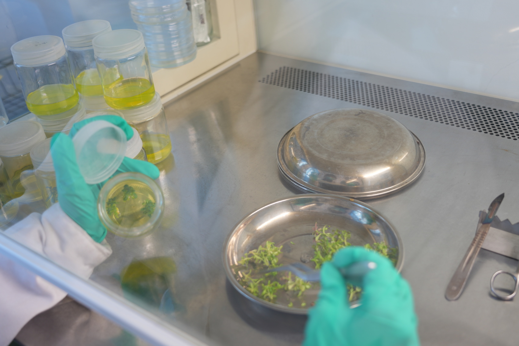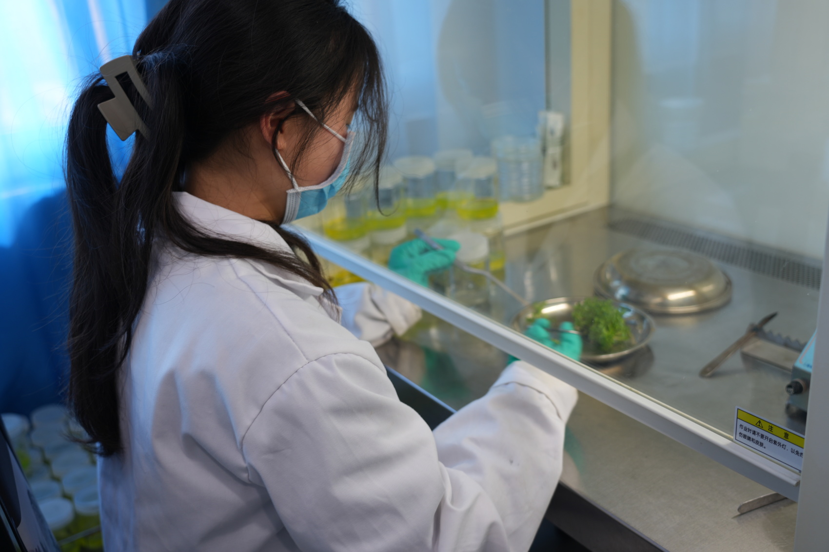 超净工作台前,科研人员正用镊子、剪刀精准切割嫩茎,接种到特制的培养基中增殖、生根。而已经生根的幼苗,移栽至特制配方的轻基质段中,逐步适应外界环境,培养到30厘米高即可造林。