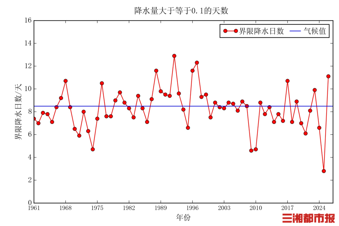 省气候中心1991—2020年的数据统计,湖南3月平均雨日17.5天。1961年以来,3月雨日超过20天的有12年,最多的1992年达到23.6天。