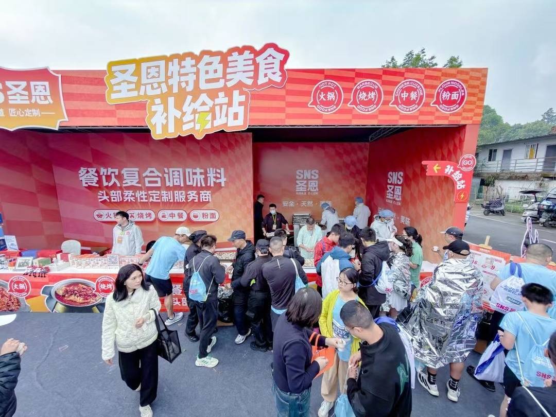 圣恩股份的火锅底料、轻食调料包十分吸睛,蜜缘枣业、疯味牛咖的试吃台前排起长队……位于村跑主会场的“村糖会”展区十分热闹,吸引不少跑者和游客争相品尝和购买。