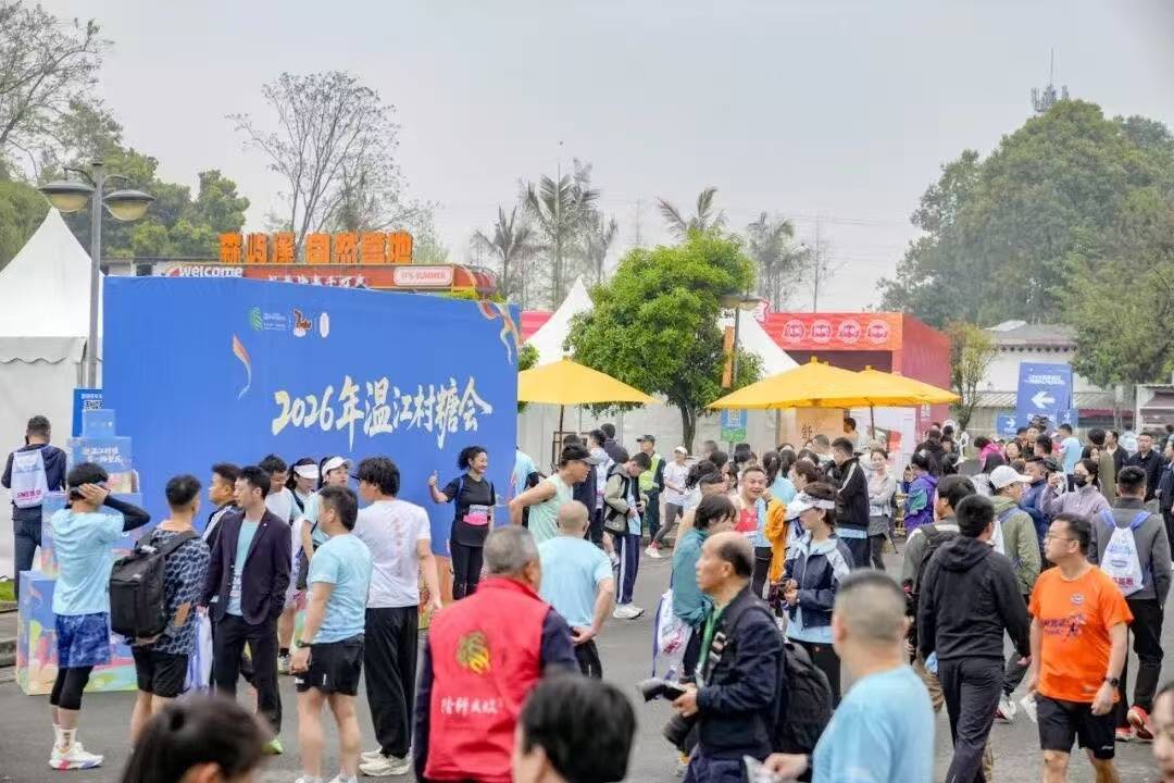 “村糖会”期间,作为展会与赛事深度融合的特色活动——2026圣恩温江“一路繁花”快乐村跑也在此鸣枪开跑。现场人头攒动、烟火气升腾,圣恩调味品、金星啤酒、兰菲米苏等众多“温江造”产品格外抢手,跑友和市民游客在移步换景间畅享消费乐趣,感受温江产业发展的蓬勃生机。