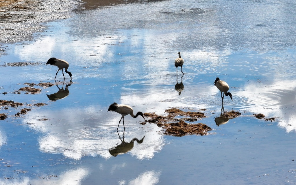 3月29日,黑颈鹤在嘎曲河红原县月亮湾段觅食。